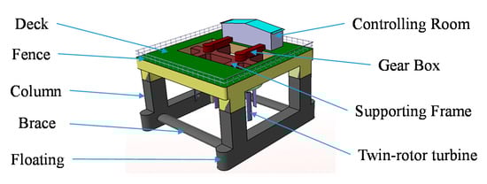 In this paper, a four-column semi-submersible tidal current power station is designed by adopting a vertical-axis counter-rotating double-rotor turbine. The main structure of the FTCPS includes the main floating bodies on the left and right sides, two symmetrical lower beams, four columns, the platform deck, and the upper buildings. Figure 2 shows the sketch of the floating tidal current power station model. The twin-rotor turbine is symmetrically deployed.