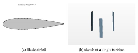 The airfoil of the turbine is NACA-0018, as shown in Figure 3a. The designed capacity of a single turbine is 120 kW, the designed flow velocity is 2.5 m/s, the turbine’s diameter is 8 m, and the airfoil chord length is 1 m. A sketch of the turbine is shown in Figure 3b. To increase the computation efficiency and minimize the influence of unnecessary components of the FTCPS, the FTCPS has been simplified in the numerical simulation process. A simplified model of the FTCPS is shown in Figure 4.