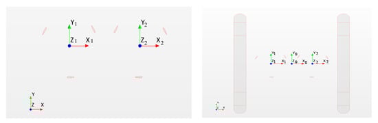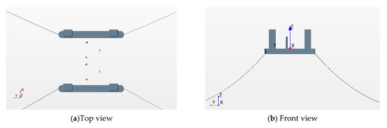 In the present numerical simulations, a global fixed coordinate system (XYZ), one 6-DOF coordinate system (X0Y0Z0), and two local rotating coordinate systems (X1Y1Z1 and X2Y2Z2) has been established in the computational domain. As shown in Figure 5a,b, in the simulation process, the left turbine rotates clockwise in X1Y1Z1 by the Z1-axis, while the right turbine rotates counterclockwise in X2Y2Z2 by the Z2-axis. This internal counter-rotation method can maximize the power output of the twin-rotor system, which has been proved by many researchers []. As has been mentioned in Section 3.1, the rotation coordinate (X1Y1Z1 and X2Y2Z2) of the twin-rotor turbine is coupled with the platform’s body motion coordinate X0Y0Z0. The carrier is set as a DFBI body. The carrier and the turbine are connected by a virtual hinge. The virtual hinge can transmit the force and momentum between the carrier and the turbine at each time step.