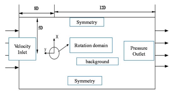 The size of the whole computational domain is shown in Figure 8. The numerical tank measures 20D × 10D × 10D (D is the diameter of the turbine). The entrance of the computational domain is set as velocity inlet, and the incoming flow speed is 1.5 m/s. The outlet and the top of the computational domain is set as pressure outlet, and the relative pressure is set as 0 Pa. The bottom is set as a solid wall. Both sides of the computational domain are set as symmetry planes.