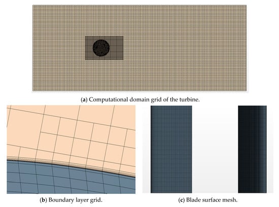 The trimmed cell mesh technique was used in the mesh generation for the whole numerical simulation cases. Due to the complex rotation and 6-DOF movement of the turbine, the mesh around the turbine blade has been refined to capture the flow separation and accurately simulate the mesh around the turbine blade, and the free surface has been refined to accurately simulate the physical scene and capture the flow separation near the blade surface. The mesh around the interface between the water and the air has also been refined to maintain the stability and accuracy of free surface in space and time. The generated computational domain grid, boundary layer grid, and blade surface grid are shown in Figure 9a–c. During the mesh generation around the blade surface, there are 8 layers inside the boundary, with a first layer of 0.0004 m and a progression ratio of 1.5.