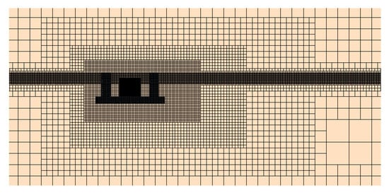 For the numerical simulation under uniform flow conditions, due to the existence of the free surface, the motion of the carrier and the turbine will lead to the mesh deformation of the free surface. Therefore, the surrounding grid needs to be encrypted to maintain the stability of the free surface in space and time. At the same time, to reduce the error caused by the iterative transmission of data between grids, this paper encrypts the grid from the rotation domain to the background domain layer by layer, and the overall grid division of the computational domain is shown in Figure 10.