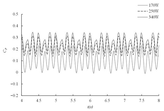 Figure 13 shows the time history curve of turbine power output efficiency at different tip speed ratios (TSRs). It can be seen that, under the condition of uniform flow, the power output efficiency changes periodically, and its change period is consistent with the rotation period of the turbine. Sawtooth line sections could be observed at the time history curve of the turbine power output curve when the TSR is low. When the turbine is operating at low TSR, flow separations occurs around the blade surfaces, which caused the blade force fluctuations.