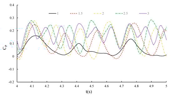 It can be seen that the fluctuation rate of the turbine with 6-DOF motion is bigger than the fixed turbine. The motion response of the carrier caused higher flow fluctuations for the incoming flow acting on the turbine disk, leading to larger power output fluctuations for the turbine. The average power output of the turbine in case A is 0.24, while the average power output of the fixed turbine is 0.2. The power output increasing of the floating turbine is caused by the two front columns of the carrier. The submerged part of the column changed the boundary conditions of the flow field around the turbine. The two front columns are similar to a flow deflector, which increases the flow velocity passing through the turbine. A flow acceleration zone is clearly observed in Figure 26. The flow velocity increasing effect would be thoroughly discussed in Section 4.4.1.