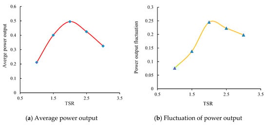 Figure 14 shows the fluctuation amplitude () and average value () of power output efficiency of the turbine at different speed ratios. It can be seen that, as the speed ratio increases, both  and  first increase and then decrease. When the speed ratio approaches 2, both  and  reach their maximum values. Meanwhile, when the speed ratio is increasing from 1 to 2, the increasing trend of  is faster than that of , and, when the speed ratio is from 2 to 3, the decreasing trend of  is slower than .