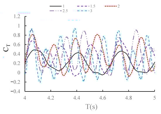 Figure 15 shows the time history curve of the thrust coefficient of one of the turbine at different TSRs. It can be seen that, as the TSR increases, the fluctuation rate of the thrust coefficient becomes more intense. It can be seen from Figure 16 that the average thrust coefficient () is positively correlated with the change of the speed ratio because the thrust of the hydraulic turbine increases with the increase of the speed ratio.