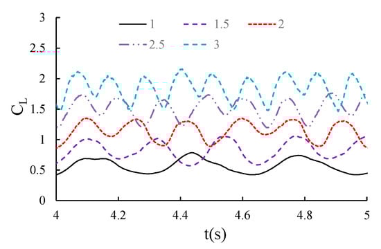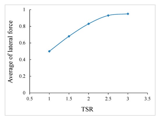 Figure 17 is the time history curve of the lateral force coefficient of a single turbine at different speed ratios. It can be seen that the lateral force coefficient of the hydraulic turbine changes periodically, and its change period is consistent with the rotation period of the hydraulic turbine. When the speed ratio is low, the lateral force fluctuation of the hydraulic turbine is small. As the speed ratio increases, the lateral force coefficient of the turbine increases, and the fluctuation become more intense. Figure 18 shows that the amplitude of the lateral force coefficient of the turbine () increases with the increasing speed ratio, but the increasing trend gradually slows down. As the speed ratio increases, the average value of the lateral force coefficient () first increases and then decreases. The maximum lateral force coefficient at the best speed ratio of 2 is 0.35. At this time, the hydraulic turbine continues to receive positive lateral force. This is because changing the direction of rotation will change the direction of the side force. In order to offset the influence of lateral force on the rolling and swaying motion of the turbine and its carrier, the usual method is to arrange an even number of inwardly rotating turbines side by side.