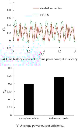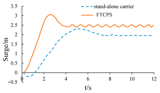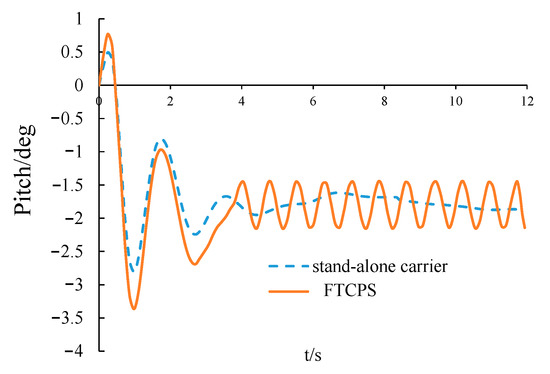 Figure 23 shows the comparison of pitch motion response with respect to time due to the operation of twin-rotor turbine. In the initial stage, the motion response of the two scenarios is almost the same. However, the pitch motion of the stand-alone carrier is almost a constant value when the carrier moves to the equivalent position. The average pitch angle is −1.77°, which implies that the carrier is trimming by head. Compared to the stand-alone carrier, the pitch motion of the FTCPS is also trimming by head. However, the pitch motion of the FTCPS is almost sinusoidal when the carrier reaches equivalent position. The pitch motion frequency of the FTCPS is almost equal to the rotation period of the twin-rotor turbine. The average pitch angle is −2.25°, which implies that the thrust of the twin-rotor turbine would increase the trimming by head situation, which increases the risk of wave running-up.