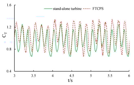 Figure 20 shows the comparison of thrust coefficient with respect to time for the twin-rotor turbine. The maximum value of thrust for the floating turbine is 1.3 times that of the fixed turbine. The fluctuation rate of thrust for the floating turbine is 1.13 that of the fixed turbine. The deflector effect of the columns increased the power output of the floating turbine, but it also increased the thrust. As for the fluctuation rate difference between the two cases, the motion response of the carrier increased the flow velocity changing rate acting on the turbine, which definitely would increase the fluctuation rate. It can also be observed that the fluctuation frequency of the thrust for the floating turbine is almost equal to the fixed turbine, which implies that the motion response of the carrier would not influence the thrust frequency response characteristics.