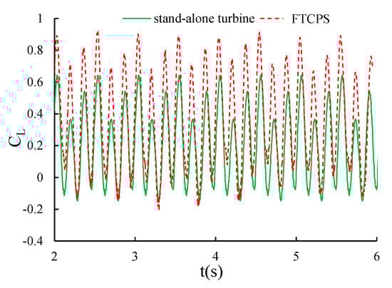 The change of the lateral force of the twin-rotor turbine will affect the rolling and swaying motion of the vertical-axis tidal current turbine. Figure 21 is a time history curve of the lateral force coefficient of the vertical axis turbine. It can be seen that the fluctuation range and maximum value of the lateral force coefficient of the turbine with a carrier are 1.125 times and 1.3 times that of the turbine without a carrier. The reason is that the carrier increases the lateral force acting on the turbine. However, the minimum values of the lateral force coefficients are all-around 0. It can be seen that the lateral force coefficient is much smaller than thrust coefficient. The lateral force between the two rotor is opposite leading to the resultant of lateral force decreasing. Meanwhile, the carrier is equivalent to shortening the distance from the turbine to the boundary. The reflected wave formed by the fluid passing through the surface of the carrier is also one reason for the increase in the lateral force coefficient.