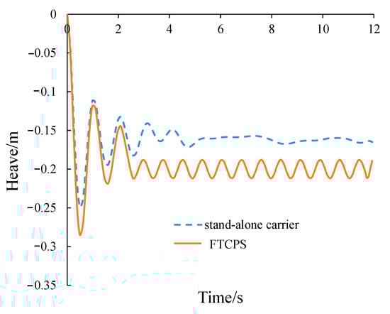 Figure 24 shows the time history curve of the heave motion response of the carrier. It can be seen that the heave motion of the carrier with turbine is much bigger than the stand-alone carrier. The stand-alone carrier would stay steady when the carrier moves to the equivalent position. The heave motion of the stand-alone turbine can be neglected compared to the carrier with the twin-rotor turbine. For the FTCPS, the heave motion is also sinusoidal. The heave motion frequency is also linked with the turbine rotation period. Due to the existence of the twin-rotor turbine, the full system would reach a new equivalent position.