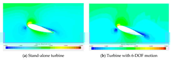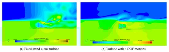 Comparison of vertical iso-velocity field for the fixed stand-alone turbine and the turbine with 6-DOF motions. (a) Fixed stand-alone turbine; (b) Turbine with 6-DOF motions.
