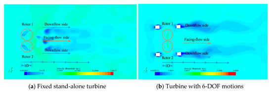 Comparison of velocity field between the fixed stand-alone twin-rotor turbine and the twin-rotor turbine with 6-DOF motion. (a) Stand-alone turbine; (b) Turbine with 6-DOF motion.