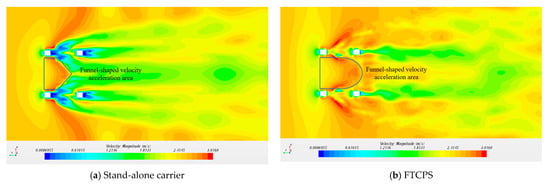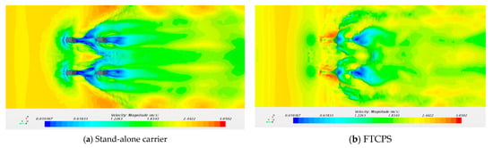 Comparison of the vertical section iso-velocity flow field for the stand-alone carrier and the carrier with twin-rotor turbine. (a) Stand-alone carrier; (b) FTCPS.