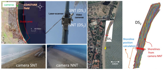 Area of interest (COASTVAR field experiment location) with the location of video cameras and shoreline detection by video imagery.