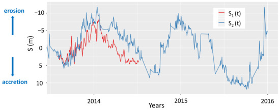 Time series of shoreline position from (red line) and from (blue line).