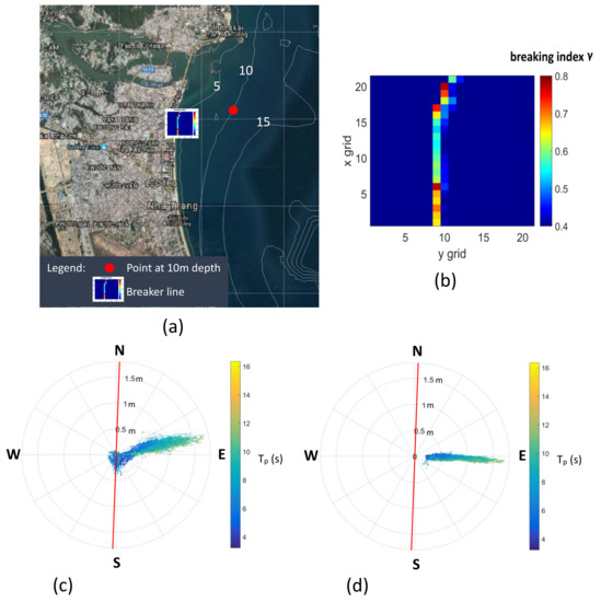 (a) Locations of point at m depth and of breaker line used for extracting SWAN wave characteristics. (b) Breaker line along the shoreline at PF1 detected from a SWAN grid region of 400 m × 400 m; colorbar indicates the breaking index. “x grid” is the index of “X”, while “y grid” is the index of “Y”; “pixel” is a grid cell of 20 m × 20 m. Directional plot of the significant wave height (circles) and the peak wave period (colorbar) from SWAN at m water depth (c) and at breaking point (d). The red line is the beach orientation. North (N) corresponds to .