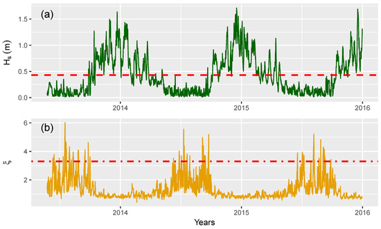(a) Time series of SWAN significant wave height at m depth (green line) and the horizontal line at its mean value m (red dashed line). (b) Time series of the surf similarity parameter (yellow line) and the horizontal line at the threshold value of (red dashed line).