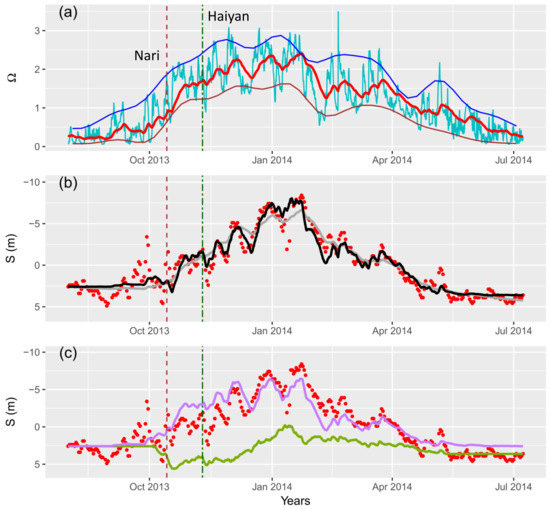 The combined model calibrated with . (a) Time series of (green line), (red line), upper envelope (blue line) and lower envelope (brown line), vertical lines indicate the time of Nari and Haiyan typhoons. (b) Time series of measured shoreline position (red points); shoreline position from combined model (black line); shoreline position from ShoreFor model (gray line). (c) Cross-shore contribution (purple line) and longshore contribution (green line).