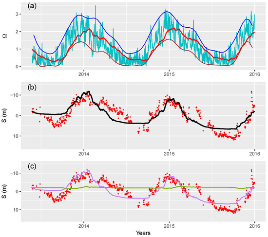 To remedy to this summer limitation, we consider the special case of very low energy waves with surf similarity parameter higher than . In this case, is assigned a constant value of 0.8 (near the annual mean), so that the beach would accrete in summer when < 0.8 and (Figure 11a). Figure 11b confirms that the shoreline position from the combined model with modified improves significantly and the modeled shoreline position is now remarkably close to observations during the summer (compare Figure 11b with Figure 10b). The RMSE is m, which is much lower than the previous one ( m). The values of the calibration parameters a, b, and c are , , and , respectively. The erosion ratio r is , and the optimal memory decay is now days instead of days in the previous case. The relatively short time scale of days encompasses that of winter monsoon pulses [28], on which the model can now focus more optimally. This is in line with the multi-scale approach of ShoreFor developed in [17,41], but within a simpler formulation. Figure 11c also shows that the seasonal fluctuation of the longshore contribution is now more pronounced than in the previous calibration (Figure 10c). For a longer interannual evolution, a period of three years is still too short and we will rely in the future on satellite monitoring for periods up to 30 years [43,44,45]. This will likely help in understanding the interaction between wave forcing and shoreline evolution at different time scales.