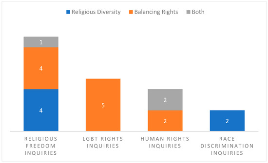 Eleven inquiries into other human rights issues included consideration of religious freedom. Unsurprisingly, the two race discrimination inquiry reports represented the religious freedom problem as one of religious diversity (Figure 1). Both reports strongly connect discrimination based on race and on religion. Of the four reports of broad-based human rights inquiries, the 2009 National Human Rights Consultation (Brennan et al. 2009) and the 2015 Traditional Rights and Freedom Inquiry (Australian Law Reform Commission 2015) included the religious diversity problematisation. Significantly, the 2013 inquiry report into the draft bill to consolidate anti-discrimination law only addressed religious freedom as a balancing rights problem (Senate Legal and Constitutional Affairs Legislation Committee 2013). This draft bill was strongly opposed by the majority of churches which regarded ‘the perceived failure of the state to properly balance freedom of religion and freedom of speech [in their favour] against the right of individuals to be free from unjust discrimination’ as ‘a profound threat’ (Poulos 2018, p. 130). That all five inquiry reports into LGBTIQ rights would represent the problem as the law needing to balance the rights of LGBTIQ people against the right to religious freedom, demonstrates how entrenched is the thinking and the discourse that religious freedom is threatened by LGBTIQ rights.