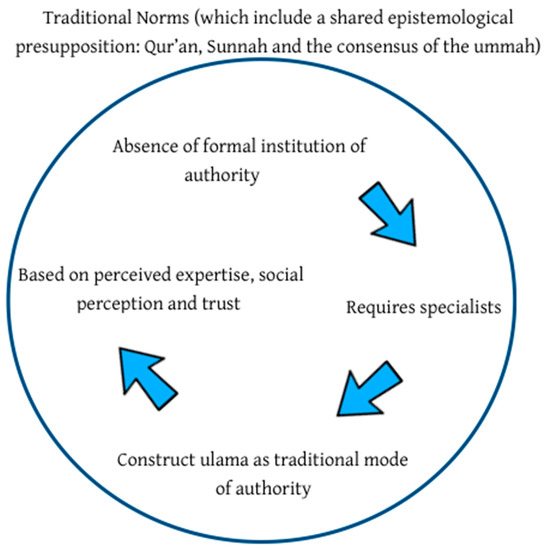 Weber (1947) distinguishes between three types of authority in modern societies: Charismatic, traditional and rational-legal. They are in turn legitimated by another typology of norms or legitimate normative orders which include tradition, effectual attitudes, a rational belief in some form of absolute value, and assent to some form of legal enforceability (Spencer 1970). Both norms and authority are present in a symbiotic relationship in any institutional structure. Relevant to this study is the traditional authority which emerged after the charismatic authority of the Prophet (Dabashi 1993). This was in turn legitimated and circumscribed broadly by the Quran and the Prophetic way, his Sunnah, and synthesised formally through the various legal schools (madhabs). Its interpretation passed into the hands of the ulama who emerged in the absence of a formal institution of authority in Islam (Berkey 2001; Crone and Hinds 2003). Following Abou El Fadl (2013), who distinguishes between “being in authority” and “being an authority”, the ulama acquire their authority by virtue of the perceived competence they possess to understand God’s law. Authority, then, is based on social perception and trust, while it is circumscribed by a normative tradition (see Figure 1).