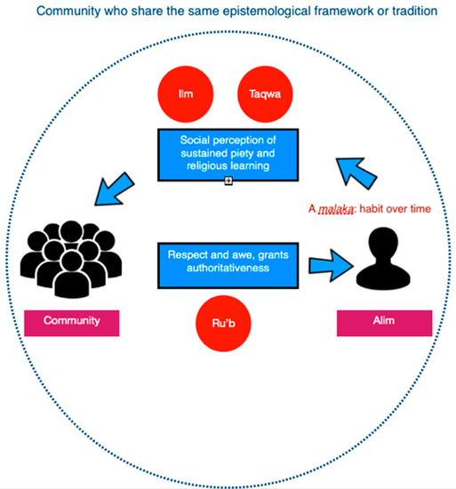 In essence, they personify for many what knowledge (ilm) is about: It must be practised to be fruitful, while its carriers ought to be disinterested with superficial worldly distractions. The former, referred to as malaka in Arabic, is the enduring ethical disposition or habit that emerges as a result of nurturing and discipline. Therefore, the social perception of sustained piety and religious learning and its embodiment leads to a greater level of public respect from a community who share the same “epistemological framework” (Friedman 1973, p. 83). Social perception is, therefore, a critical ingredient in attributing a higher level of authoritativeness to an alim. It is these luminaries who shine the light on the way for others. The diagram below (Figure 3) theorises the findings, thus far: