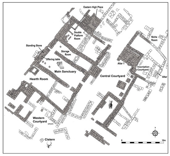 Figure 4). The main room (8.5 × 11 m) had a large unhewn stone slab standing upon a pedestal built in the niche and contained a variety of objects, among which were a large pottery bull, jars decorated with bulls heads and a fenestrated altar with two male figures. The other rooms featured a square stone-built hearth of 2 × 2 m in one room and two stone-built platforms in the other. All in all, “hundreds of cultic objects” have been retrieved from the temple complex (