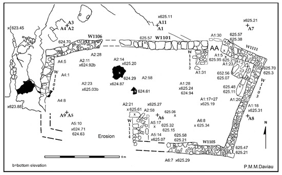 2017). On a hilltop, a perimeter wall enclosed an area of c. 7 × 14 m. Large stones inside the wall may have served as benches (