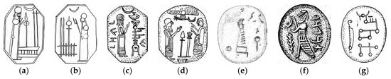 - Stylus of Nabu—This symbol of the Babylonian god of writing (Black and Green 1992, pp. 133–34; Millard 1999, p. 607) appears on a number of seals from Ammon, often alongside the spade of Marduk. Together they were two of the most popular gods in Mesopotamia during the first millennium BCE (Millard 1999). All of the seals are conoid stamp seals except ʿAmman 88, which is a cylinder seal, and Tall Safut 5, which is a bulla: ʿAmman 3 and 88 (CSAJ, pp. 10–11, 58–59; Figure 5a and Figure 10a), Meqabelein 1 (CSAJ, pp. 190–91; Figure 5b), Tall al-ʿUmeiri 44 (CSAJ, pp. 336–37); Tall Safut 5 (CSAJ, pp. 436–37).