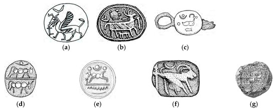 - Griffin—A mythological creature with leonine body and tail, wings, and an eagle/bird head (Black and Green 1992, pp. 99–101) appears on two conoid stamp seals ʿAmman 4 and 54 (CSAJ, pp. 10–11, 42–43; Figure 6a). Two more appear on the cylinder seal Tall al-Mazar 24 (CSAJ, pp. 306–7; Figure 9f), with an additional example on the scaraboid stamp seal Tall Dschalul 2 (CSAJ, pp. 420–21). Two additional griffin-like figures appear on Tall al-Mazar 23, a cylinder seal, but the body type is difficult to identify (CSAJ, pp. 306–7; Figure 4b).41