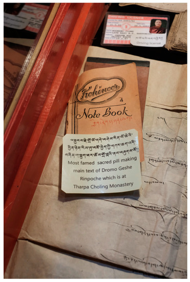The museum was established in one of the side buildings of the newly renovated monastery, adjunct to the small meditation room where the first and second Domo Geshe Rinpoches used to sit, practice, and see, heal, bless, and advise people, and also give out consecrated pills. In one of the museum showcases, we found the cover of a small notebook with the hand-written Tibetan title “Catalogue of Relics,” or jinten karchak (byin rten dkar chag), which refers the list of ingredients used to make these jinten pills (Figure 2). On inquiry, we found out that the notebook was empty and that the original pages were kept in secret with the current geshe of the monastery for future times, when the third reincarnation of Domo Geshe Rinpoche, currently a teenager, would be able to make these pills again. A few months earlier, a Tibetan doctor near Dharamsala, who is closely linked to the Rinpoche’s family, told me that he had been asked to help procure the ingredients when the time comes to make the pills again. This is an example of a collaboration between medical and ritual specialists in the making of such pills across time and reincarnations. The historical contexts surrounding such collaborations will be explored in Section 3.