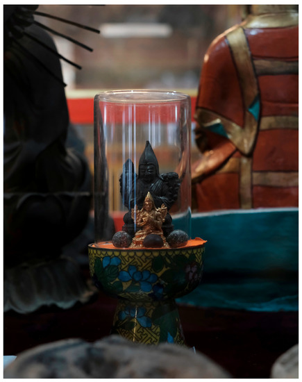 The Second Domo Geshe Rinpoche, Ngawang Jigme, who was born in Sikkim in 1937, came to Kalimpong in 1961 after a period of imprisonment in Tibet during the Chinese takeover, which left him in ill health. In the 1970s, he moved to the Unites States, where he passed away in 2001. He visited Kalimpong once in a while and less during the mid-1990s when the Dorjé Shukden controversy peaked in Tibetan communities. At the time, the worship of the Gelukpa protector deity Dorjé Shukden was demoted by the 14th Dalai Lama within its own Gelukpa school in an effort to become more inclusive of other Buddhist schools.12 It turned into a question of loyalty when Shukden worshippers were requested not to receive tantric initiations by the Dalai Lama; this “effectively placed them outside the fold of the exiled Tibetan polity“ (Mills 2003, p. 60). At the time, I lived in Kalimpong and noted how this issue led to religious confusion and split the Tibetan community. Dorjé Shukden was the main protector deity of Tharpa Chöling; consequently, many local Tibetans avoided the monastery. In 2018, Dikila assured me (as does the Wikipedia page of this monastery)13 that the controversy was long over, no Shukden worship was carried out at the monastery, and local Tibetans were free to visit the monastery again. Moreover, the reincarnation of the Third Domo Geshe Rinpoche (b. 2003) was recognized by the 14th Dalai Lama in 2005, and the monastery is now supervised by the Central Tibetan Administration.