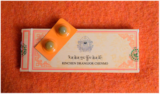 Profound intermingling of Buddhist and medical elements is characteristic of Tibetan pill traditions. We know that “accomplished medicine” practices from the early Buddhist Nyingma traditions significantly shaped the development of Tibetan medicine (Garrett 2009, p. 209). It comes to no surprise to find that powerful damdzé substances in the form of consecrated compounds (mentioned in the introduction) made their way into the compounding of special precious pills (rin chen ril bu), which form the pinnacle of Tibetan medicine preparations or menjor (sman sbyor) (Figure 6). Precious pills are made by amchi, in the past often together with their lamas, and were generally sponsored by influential sections of Tibetan society (Gerke 2017). Even their recent institutionalized production in larger pharmacies is still connected to Buddhist lineages.