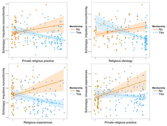 Associations between religiosity and schizotypy by membership in a religious community. The band represents the 95% confidence interval.