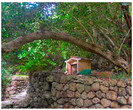 Although widely promoted as a tourist destination with a beautiful natural environment, in reality, Okinawa has a number of serious environmental problems. These range from coral bleaching to rapid species loss, and from toxic pollution to habitat destruction due to military base construction and tourist development (Dias and Murayama 2018; The Japan Times 2018; Mitchell 2017). Presumably, sacred groves are important for biodiversity conservation. In contrast to mainland Japan, however, in Okinawa there has not yet been systematic, island-wide research on the ecology of sacred groves, and nature conservationists have not paid much attention to utaki. But there have been some small-scale research projects that focused on mapping the species composition of selected utaki and gusuku sites, for instance at Sēfa Utaki (Okinawa Shizen Kenkyūkai 1982; Chinenson Kyōiku Iinkai 2002, 2003). This research showed that Sēfa Utaki is characterized by impressive species diversity: scientists counted 250 different plant species in the forest, of which 218 were said to be native to Okinawa (Chinenson Kyōiku Iinkai 2003, p. 56). Sēfa Utaki is also home to a great variety of animal species, ranging from snails and butterflies to reptiles and bats (Nanjō-shi Kyōiku Iinkai 2018, p. 80), some of which are rare or endangered. As they constitute small areas of remaining natural (primary or secondary) forest, other utaki are also likely to be home to considerable species diversity, including endemic plants and animals. In any case, the hypothesis that utaki are of importance for biodiversity conservation seems worthy of further investigation (Figure 4).
