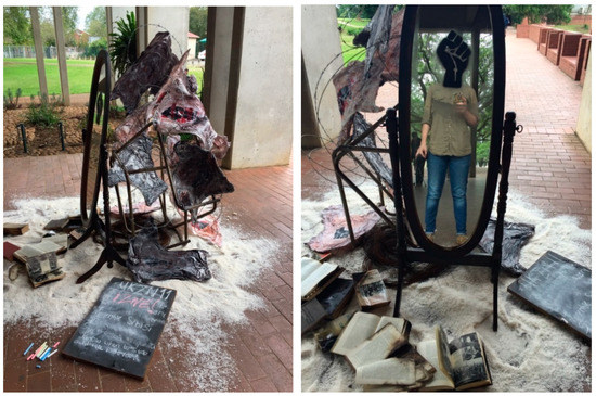 The third curatorial moment, a public sculpture, forced us to think more deeply about the pedagogic intent of our efforts as resistance art, insofar as we hoped that it would present a response to the conditions of violence, a piece that would provoke students to reflect on and speak about the violence. We produced a public sculpture that was a commentary on the collective experience of violence and arson, to mourn losses—of innocence and things, to remember trauma, fire, and fear—and the abnormality of our existence made ‘legal’ by the interdict. Four staff members developed the sculpture (Figure 3), which was made up of steel-frames of desks, barbed wire, with slogan printed t-shirts, a mirror, and burned textbooks on a bed of salt. The sculpture of charred texted books, clothes and twisted metal was meant to capture the twisted and entangled relationship of students to the university, and that it was covered in barbed-wire represented the restriction and repression of student protests. In a highly symbolic move, we placed a mirror in the centre of the piece as a way to incorporate the student-viewers into the sculpture. It provided a space of recognition, exchange, and reflection. No commentary accompanied the sculpture and we left it up to each student to leave their mark in the salt, or on the chalkboard. Many sat and discussed the meaning of the sculpture with their friends. The paradox of this curating of violence and fire, on a campus under repression was not lost on the students. Many of them were anxious that we or they would get into trouble, but we explained that we simply presented a commentary on what we observed about social and institutional relations on campuses across the country.