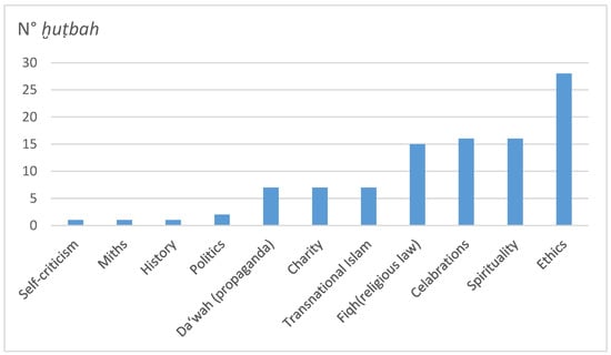 On the other hand, the topics covered in the sermons belong to different discipline and I may speak of different thematic areas that constitute the argumentative map of the sermons. The nearly one hundred sermons collected belong to eleven thematic areas as can be seen in the table below (see Figure 1). Most sermons are related to issues concerning ethics. The invitation that is addressed to the faithful is not to think about accumulating assets in this earthly life, but rather to focus on the afterlife. This sermon was held in the place of worship of a provincial town whose attendants are mostly immigrants, and specifically refugees, who are therefore looking for work, or if they have, they are still in a state of economic hardship. From the titles of the sermons, among the topics analyzed, six of them seem to deal with current topics; I report a few: (1) social networks and their correct use; (2) dialogue and ability to listen to others; (3) fight smoking; (4) dialogue within the family: how to maintain traditions and ensure that this is a need for all family members? (5) the citizenship (or al-muwâṭanah). From the analysis of the themes of the sermons on religious celebrations, instead, it emerged that all the religious leaders concentrate their homiletic production on Ramadan during the holy month. On the first Friday of holy month, the sermon recalls the rules and the importance of fasting and, in many cases, it is the same sermon repeated every year at the beginning of the month of fasting. However, this practice is different on the anniversary of the birth of the prophet. On this anniversary, the ḫuṭabâ’ can be split into three groups: (a) those who do not talk about it; (b) those who emphasize this anniversary and invite the faithful to celebrate it; (c) those who face this occasion to emphasize the knowledge of the Sunnah and invite Muslims not to celebrate it because it is a bid’ah (religious innovation). At the beginning of March, two religious leaders treated the subject of women in their sermons and both reiterated rhetorics such as: “Islam has freed women fourteen centuries ago” or “The Koran and the Sunnah have guaranteed the women’s rights since the dawn of Islam.” In this perspective of non-Islamic celebrations, it is interesting to note that, despite that the collection of ḫuṭab coincided with the Christian Easter, 25 April and 2 June 2017, these deliberations did not find place in religious discourse. See Table 1.