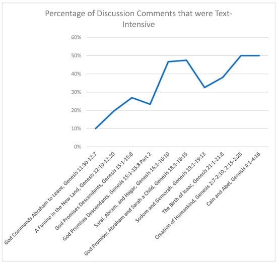 Figure 1 shows on the X-axis the Hebrew Bible text discussed in chronological order, and on the Y-axis the percentage of student comments that were text-intensive. As the year progressed, the students increasingly used the Biblical Hebrew text to talk about the text. Of course, there were fluctuations, but the overall pattern is clear. Students’ discussions of texts were increasingly rooted in the language of the texts themselves. It is important to note that the students did not begin the year quoting the biblical text in their discussions. Through the intentional design of this curricular and pedagogical intervention, which involved many different scaffolds and avenues into the text (see Appendix A), the students learned how to engage in rich text-intensive discussions.