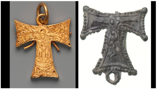 | 36 | Copper alloy was used more frequently in pilgrim souvenirs in the second half of the 15th century (Spencer 1998, pp. 167–70; Hall 2007, p. 77). A folded textual amulet was found in the Ingleby Arncliffe Crucifix (Skemer 2006, p. 183). Personal reliquary crosses, popular in Byzantium, were often incised with images of holy figures on their exterior. See, for example, the “Reliquary Cross with Saint George [Byzantine] (2000.526.2)” at. http://www.metmuseum.org/toah/hd/priv/ho_2000.526.2.htm. In the West, these items were made out of precious materials beginning around 1000. |
