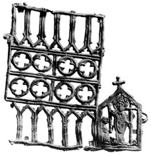 | 33 | The other example has three vertical sides and two roof panels that could be folded into a three-dimensional reliquary châsse. Measuring 7.7 × 3.5 cm, done in openwork patterns with clips (Pieters et al. 1997–1998). Now in Oostende, Heemkundig Museum De Plate. See also Kühne et al. 2012, p. 150, cat. 266; and Praha 1985, p. 25, no. 186 (UPM 5 641/1894), 14th–15th century, 4.3 cm in height. |