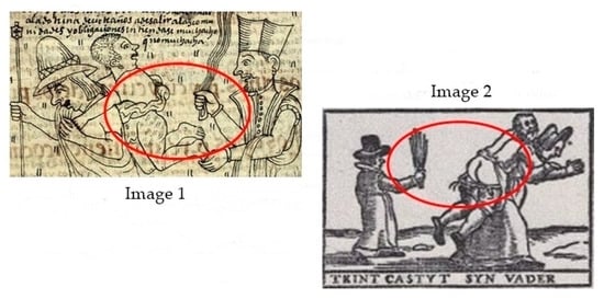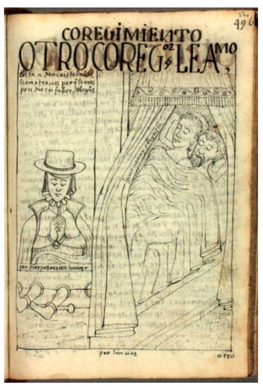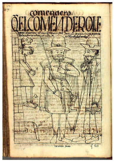 This didactic and persuasive conscience of the relations between word and image is revealed in the gloss itself with the phrase “Look at this poor don Cristóbal de León, how he is admonished and prosecuted, they sleeping and thieving and robbing, playing, they turn out rich. The poor suffer great works” (). The information on place (pictura), the imperative “look” and the deictic “this”, together with adjectives “poor”, “admonished”, and “prosecuted”—rhetoric elements that seek to animate the passions of the reader—make manifest the assumption, by the chronicler of the Tridentine principles, on the convenience of the use of images in predication (), and of the pictorial–sensory followers of Ignacio de Loyola.