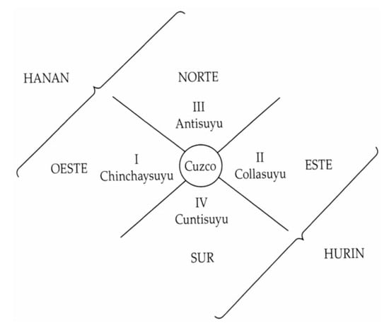In accordance with the iconographic readings of () and, more recently, (, ), the iconography of the chronicler–artist maintains the dual hierarchical perspective of the Andean universe, based on opposing yet complementary pairs: up–down, (Hanan–Hurin), right–left, masculine–feminine, old–young, heaven–earth. From this system, the spatial topology of the Tawantinsuyu could be understood, the Andean world of the four pathways: Chinchaysuyu (Northerly Path), Antisuyu (Easterly Path), Collasuyu (Southerly Path) and Cuntisuyu (Westerly Path). The formation of this organization would take Cuzco as the center, ‘the belly-button of the world’15, on which basis it could be defined as the axis of upward–downward movement of life on earth (Hanan–Hurin). Chinchaysuyo and Antisuyo would form the first term of the pair: upwards-Hanan, while the second, (downwards–Hurin) would be formed by Collasuyu and Cuntisuyu (Figure 4).