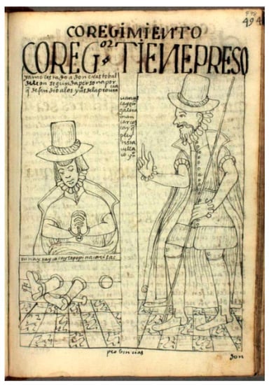 Explicitly, in the third emblem under analysis, with the caption “That the local official have the principal chief, don Juan Cayan Chire hung and to keep the official content have the corregidor hung” () (Figure 6), We see that there are three characters: Juan Cayan Chire, principal chief brought to trial, a corregidor, and a local official.