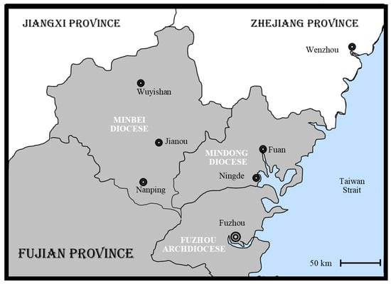In 2017, the Minbei Diocese counts only nine priests and three beatas. Its territory covers the prefecture of Minbei that hosts 3.7 million inhabitants and a few thousand Catholics (Charbonnier 2014) (see Figure 1). However, most of them have refused to join the registered side of the Catholic church and belong to ‘underground’ communities. Those communities are ministered by the underground clergy of either Fuzhou or Fu’an. Those cities are the most dynamic place of Northern Fujian Catholicism. Thus, there is no single underground ecclesial unity that covers the Minbei Diocese.
