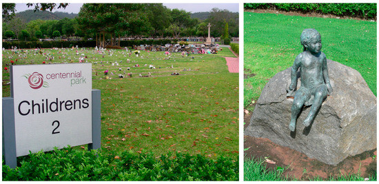 Demarcations of children’s cemetery spaces: (left) The children’s section in Centennial Park Cemetery, Adelaide; (right) symbolic figure situated adjacent to the children’s section in Enfield Memorial Park, Adelaide. Photographs: S. Muller 2016.