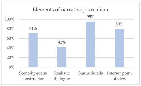 As shown in Figure 1, all the elements of narrative journalism are present in a high degree: above 40% in all the articles analysed. In this case, the least used element is dialogue. By focusing on the articles in which religion is present, most also fit into the four categories that Wolfe (1973) considered necessary for narrative journalism: scene-by-scene construction, realistic dialogue, status details, and an interior point of view (Sims 1996; Sharlet 2014). In all the media analysed, these characteristics consistently appear in a percentage higher than 50% in articles on religion, as shown in Figure 2.