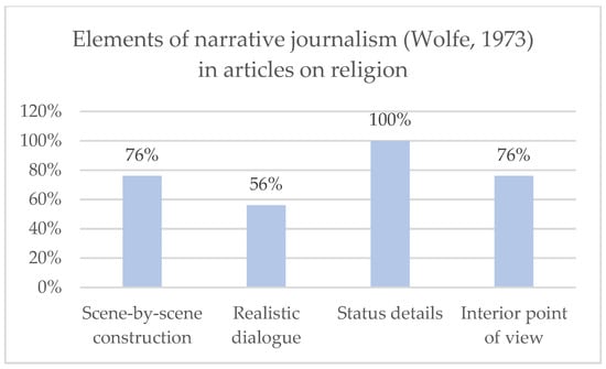 Presence of the elements of narrative journalism according to Tom Wolfe (1973) in the analysed articles on religion.