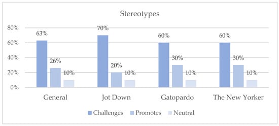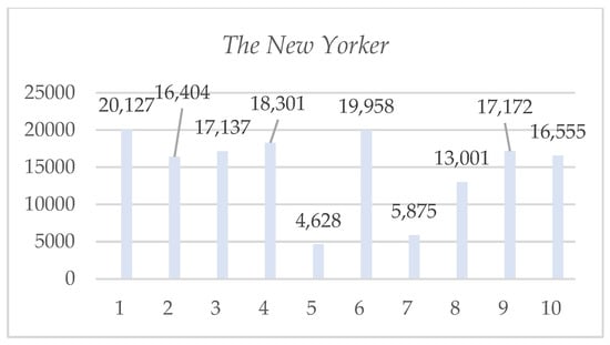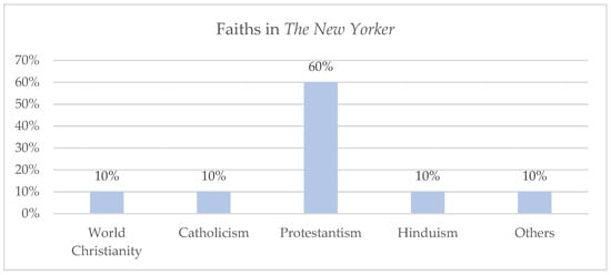 In The New Yorker (Figure 6), Protestantism is the predominant faith (60%) among the topics in which religion is present. It is followed in a much smaller percentage (10%) by Christianity in general, Catholicism, Hinduism, and other religions. According to Gallup (website 2017), in the United States, 48.9% identify as Protestant Christian, 20.8% identify as Catholic, 0.7% identify as Hindu, 0.9% identify as Muslim, and 1.5% identify as other religions. These figures coincide with those presented by the Pew Research Center’s Religious Landscape Study (Pew Research Centre 2014).