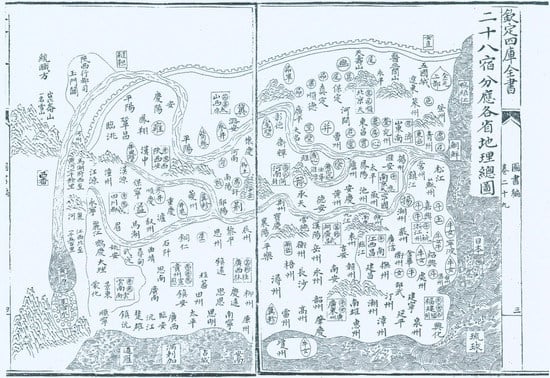 The “star fields” projected on a Ming dynasty map of China. (Zhang, Huang 章潢. Tushu bian 圖書編. In Wenyuange siku quan shu 972, juan 29, 3b-4a. Taipei: Taiwan Shangwu Yinshu, 1983).